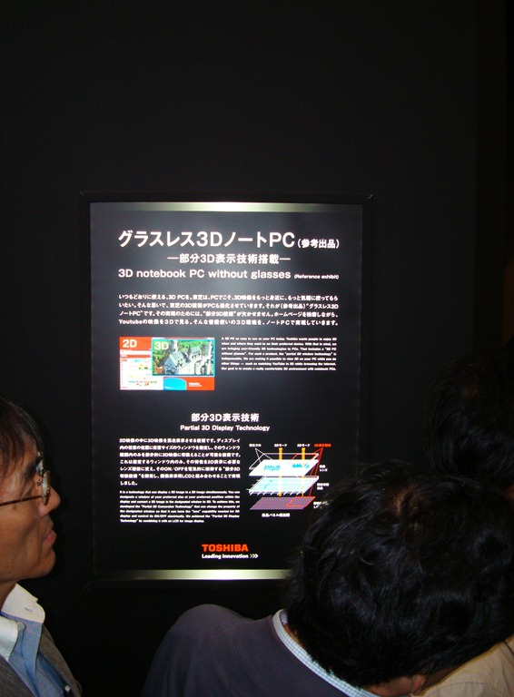 Toshiba also showcased a laptop with partial 3D window technology. Basically, the system can show 3D anywhere on the screen that marks itself as a 3D image/feed. Details were thin, but I was able to snap a few photos as to how it worked. Oh yeah, the display appeared to be six inches deep, you couldn’t touch the machine, and you had to stand four feet back (again, on a red dot). Hey, it’s a prototype!