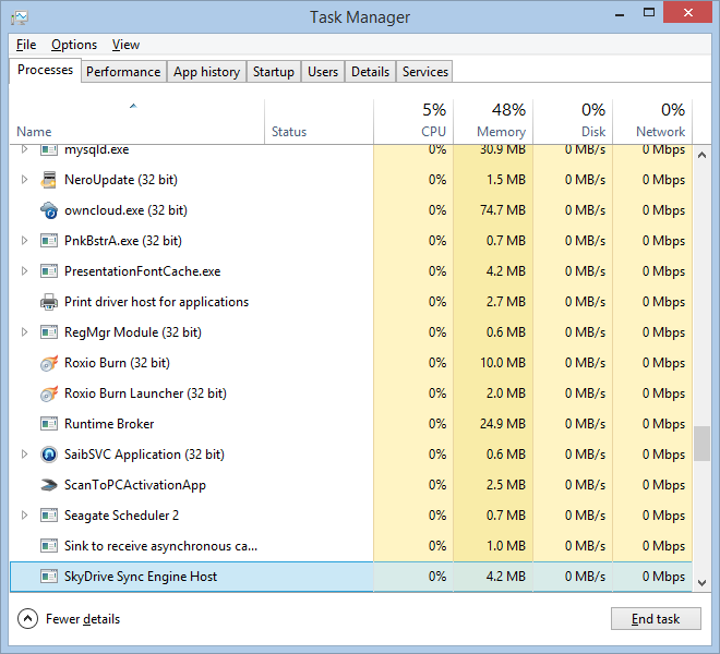 8. Start up SkyDrive by typing skydrive from that same prompt, this time without the /shutdown command, and wait two minutes. Launch the SkyDrive app from the Start menu as well, just to make sure everything’s kickstarted. Check to see if the SkyDrive Sync Engine Host process is running in Task Manager. You can press Control + Shift + Escape to bring up Task Manager, sort by name, and find SkyDrive Sync Engine Host under Processes. If the SkyDrive process doesn’t launch after a couple minutes, try restarting your machine.