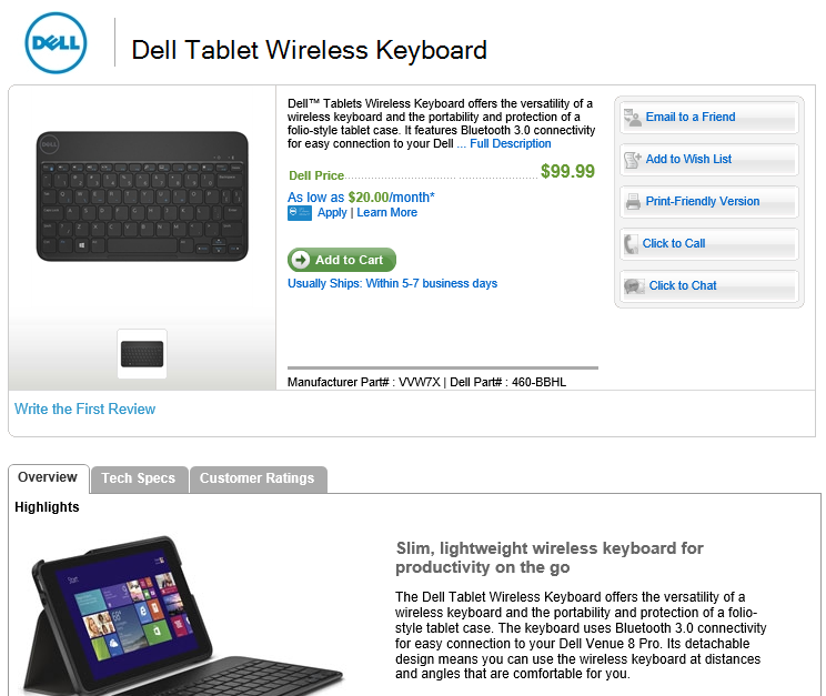 I’ve been looking around on the Venue 8 Pro product page for the Wireless Keyboard accessory, but it always says “Coming Soon.” Checking with Dell Sales Support, I was able to get the link. I’ll order one and give a review.